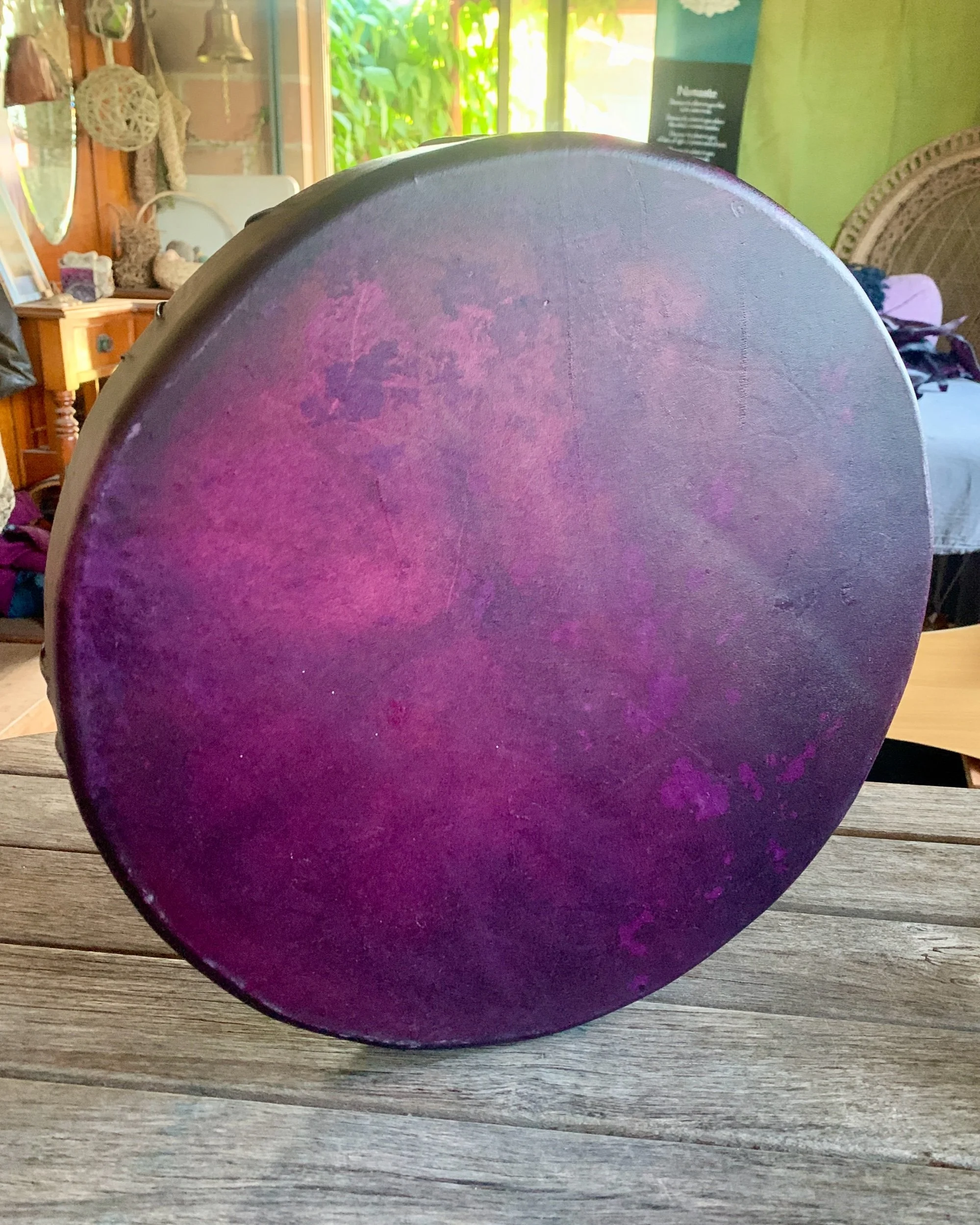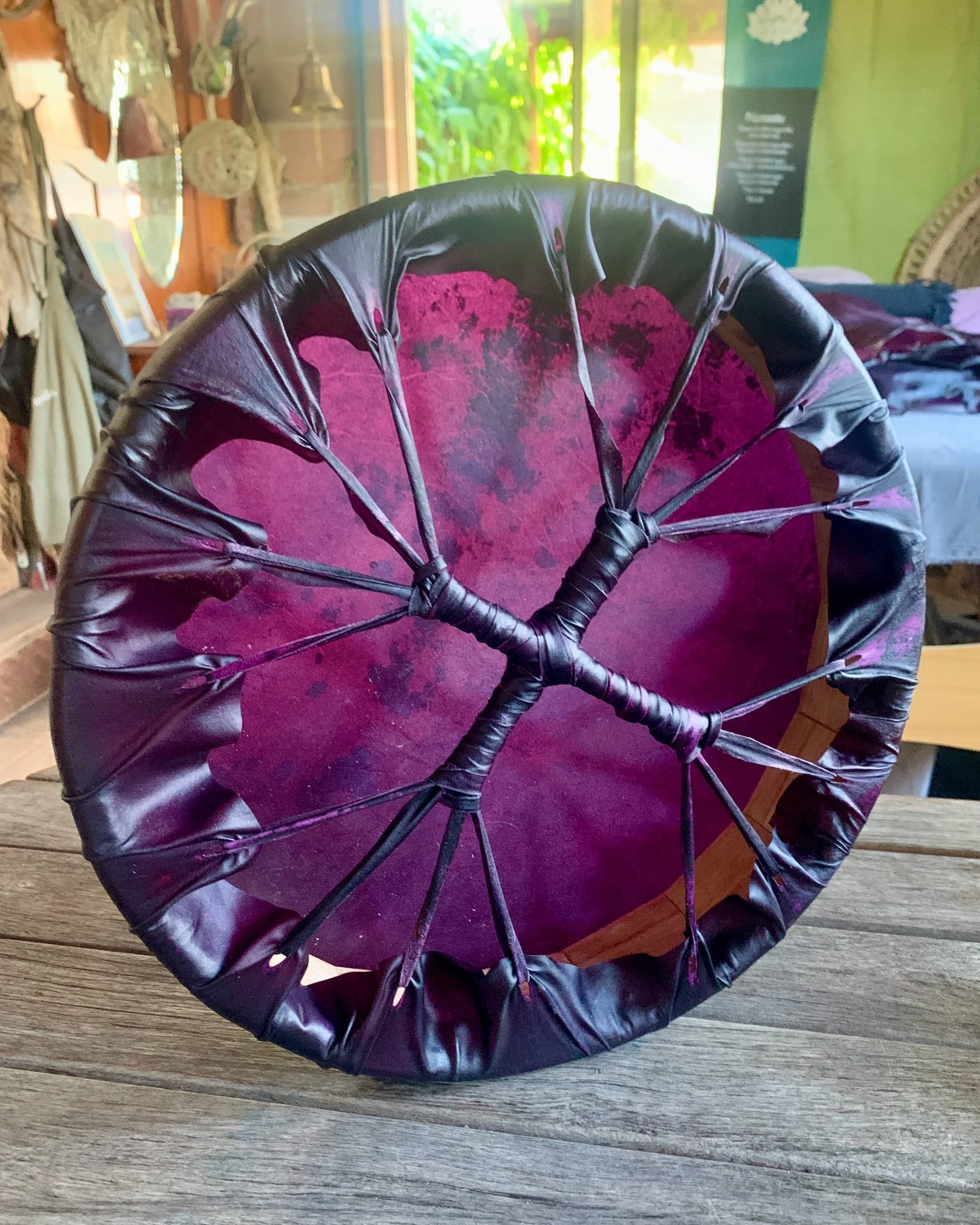 This drum has been handmade by me using kangaroo hide, naturally dyed with cochineal bugs, and stretched over a hand-crafted 14” paulownia wood frame, made by a fellow artisan whose work I deeply respect.